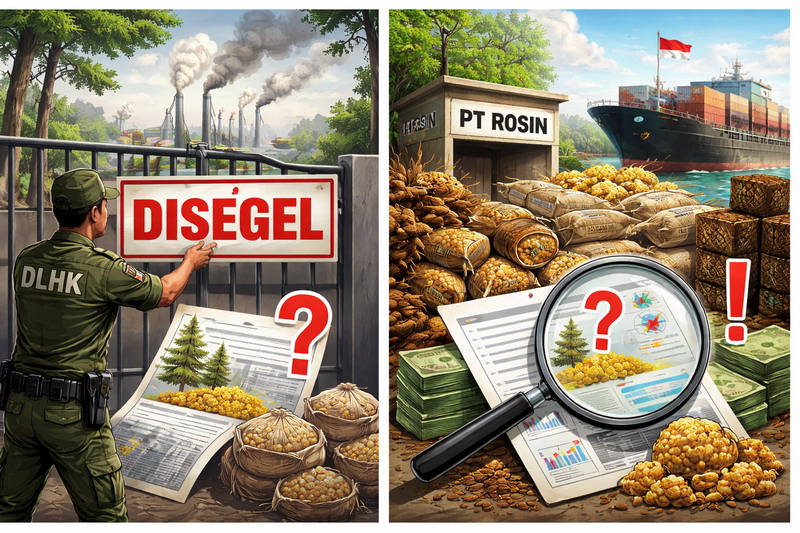 Dari jalur kehutanan, Permen LHK P.62/MENLHK-SETJEN/2019 juga relevan karena mengatur tata laksana pengangkutan dan penatausahaan hasil hutan bukan kayu, termasuk keharusan dokumen yang sah. Jika bahan baku masuk ke pabrik tanpa SKSHHBK atau tanpa kejelasan hubungan dengan konsesi yang sah, maka legalitas bahan baku ikut menjadi soal. Jika PSDH tidak dipenuhi, negara berpotensi kehilangan penerimaan yang seharusnya masuk. Jika ekspor atau pengiriman barang tetap berjalan sementara data produksi tidak sinkron dengan laporan ke instansi terkait, maka aparat penegak hukum perlu memeriksa apakah ada pelanggaran administratif, kehutanan, kepabeanan, atau bahkan pidana korporasi yang menyertainya. Bagi publik dan pegiat lingkungan, celah semacam ini justru yang paling berbahaya, karena sering muncul di balik tampilan usaha yang terlihat normal.